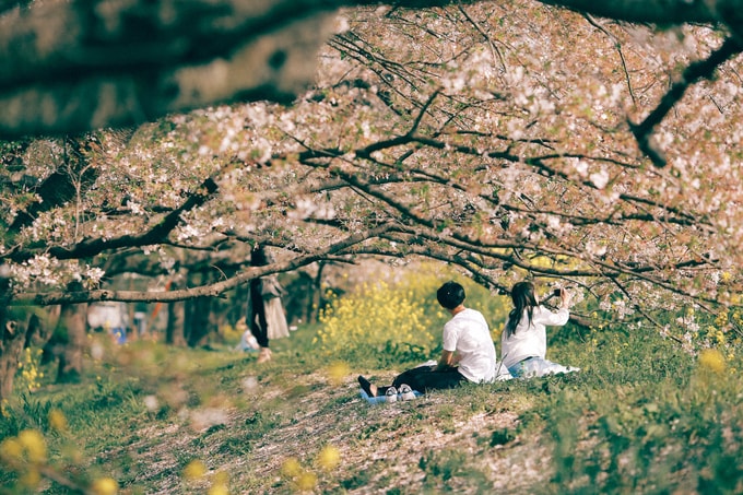 Công viên Arakawa cách trung tâm thành phố khoảng 100 km (đi tàu điện hết 1,5h) nên không quá đông khách du lịch, chủ yếu là người Nhật đi ngắm hoa nên khung cảnh rất thanh tao và yên tĩnh. Ở đây có một bờ đê dài khoảng 2km với hàng trăm cây hoa anh đào cổ thụ. Ngay bên dưới hàng đào là một cánh đồng hoa cải vàng ngợp trời. Màu vàng của hoa cải phối với màu hồng pastel của hoa đào, trên nền trời xanh rất hấp dẫn.